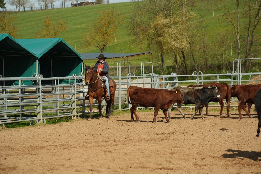 Für den Nachmittags, es ging um 14 Uhr weiter, habe ich Krümel gesattelt und Keks gleich nebenan in den Round-Pen gestellt. So hatten Beide Sichtkontakt und die Rinderarbeit war für mich als Reiter um einiges einfacher. Auch Krümel hat sich vor den Rindviechern gut verhalten und ich als Reiter habe gelernt, Kühe aus der Herde zu separieren, aus einem Gatter zu treiben und wiederum die gesamte Herde in das Gatter mit den Pferden zu bringen. Teamarbeit war gefragt. Mein Resümee ist, es hat sich für mich und meine Pferde gelohnt.