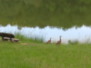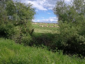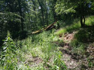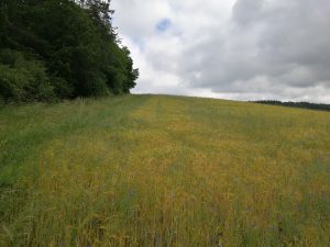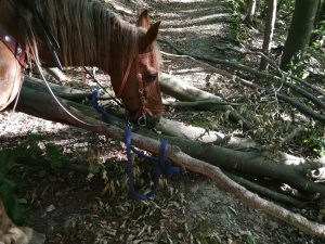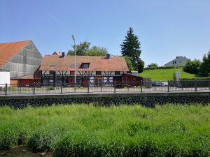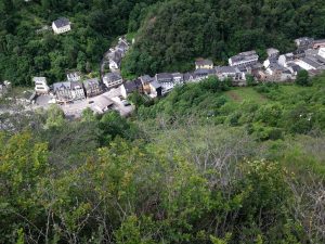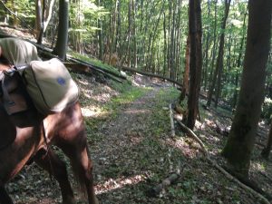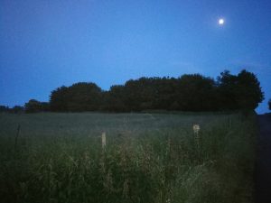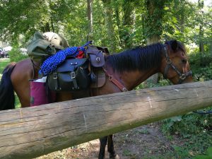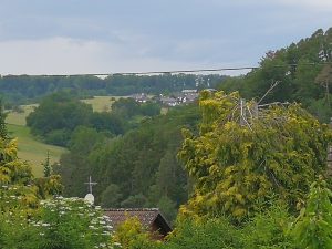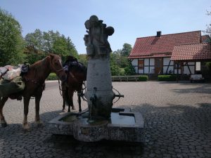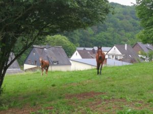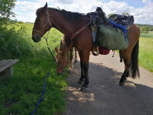 Der Gedanke war, trenne dich von der Vorstellung einen Punkt zu erreichen, sondern versuche täglich 30km in den Süden vorzustoßen. Daher auf nach Kirn, einer größeren Stadt dort gibt es sicherlich Pferdehöfe. Ja, gibt es. Leider ist dort Westernreitturnier. Doch von Vorne. Die Nacht habe ich in der Hängematte am Bach geschlafen. Gemütlich aber im Morgengrauen auch ein wenig kalt. Die Feuchtigkeit kroch den Bach herauf. Vier Uhr morgens bin ich dann aus der Hängematte und habe den Pferden einen erweiterten Platz zum Grasen eingerichtet. Sieben Uhr brachte mir Olaf’s Frau Frühstück und Kraftfutter für die Pferde. Beim Aufsatteln habe ich mir besorgt die wunden Stellen am Widerrist angesehen. An reiten ist nicht zu denken. Also auf nach Kirn Richtung Süden. Der Weg führt durch Natur zum Schloss Dhaun. Dort sehe ich einen Wegweiser nach Weiler ca. 6,5 km, aber ich will doch in den Süden. Daher ignoriere ich das Schild und laufe mit den Hotties im Rücken nach Kirn. In Kirn rufe ich den Reitstall an um zu erfahren, dass die keinen Platz haben. Empfehlung, gehe nach Weilern. Genau genommen hätte ich sofort umdrehen müssen, denn vom Eingang nach Kirn zurück nach Norden nach Weilern wären es nur 6 km gewesen. Aber nein, ich gehe zum Reitstall. Das zieht sich durch den Ort Kirn Kilometer um Kilometer bis ich die Brücke zum Reitstall finde, dann noch einen Kilometer und ich bin vor Ort. Schön ist, dass es Kraftfutter und Wasser für meine Tiere gibt und für mich nach 365 Tagen das erste alkoholische Getränk. Laut Auskunft ist es von dort eine halbe Stunde nach Weiler. Von wegen halbe Stunde. Der Weg windet sich sanft den Hügel hinauf, kein Abzweig ins Tal wird vom Navi vorgeschlagen und so gehe ich Kilometer, wie viele es zu viel sind werde ich nie erfahren. Der Weg ist lang und will kein Ende nehmen. Neun Kilometer noch. Mir brennen die Fußsohlen und der Durst bringt mich um. Der Planet sticht und wir traben, leicht belämmert, den Weg entlang. Endlich geht es über die Nahr.