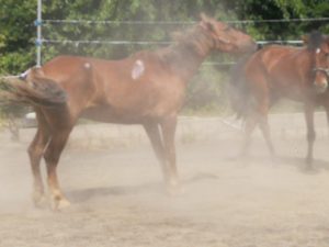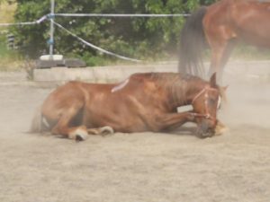 Ganz schön staubig am Reitplatz.Wälzen gehört dazu.