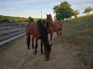 Wie löse ich das mit dem Schlafen, keine Hängematte, kein Schlafsack im Auto, Hotels rar. Es bleibt nicht anderes übrig als die Nacht im Fahrzeug zu verbringen, das habe ich schon 30 Jahre nicht gemacht. Am 3.07.2019 bin ich 6Uhr aus dem Fahrzeug gekrochen, erstaunlicher weise hat mein Gerippe nicht geschmerzt und 7 Uhr konnte ich Beate erreichen, schön. Zwischenzeitlich haben Stallmitbenützer den Schuppen aufgesperrt, sodass ich mein Gelumpe in den Kofferraum packen konnte. Es ist 8 Uhr und ich habe auch die Pferde verladen. Das ging erstaunlich einfach. Keks ist einfach „eingestiegen“ Krümel hat zwei oder drei Minuten nachgedacht und ist dann freiwillig in den Anhänger. Jetzt geht es los, danke an Beate und an alle Helfer. Fünf Stunden Fahrt sind zu absolvieren, ob ich das problemlos schaffe, habe seit mehr als 30 Jahren keinen Wagen mit beladenen Hänger gefahren. Es ging erstaunlich gut. Unterwegs versuchte ich die Hotties zu tränken, erfolglos, kein Durst.