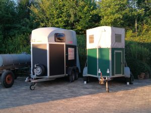 Keks und Krümel vor der Abreise.Gespann vorm Reitstall.Es ist mir mit mehreren Anläufen gelungen den Anhänger schön einzuparken