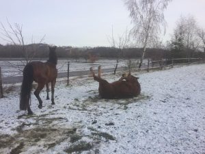 Krümel kennt das Prozedere, der hat andere Flausen im Kopf. Nach 30 bis 40 Minuten stellt Krümel fest es reicht für heute und er bleibt felsenfest stehen, wie ein sturer Bock. Den 7.12.2019 sind wir auf den Reitplatz und haben alles ausprobiert. Keks war ganz brav und unaufgeregt. Krümel bockig nach ca. 40 Minuten, wie immer. Für den 8.12.2019 haben wir einen Ritt in die Heide geplant. Das Ziel war, ca. 25 km durch Wald und Flur zu reiten um zu sehen, wie gut die Kondition von Keks und Krümel ist. Leider hat das Wetter nicht mitgespielt, es stürmte und die Pferde waren unheimlich nervös, sodass wir eine ca. 8 bis 10 Kilometer Reitrunde hinter dem Stall planten. Aufsteigen am Reitplatz war ok. Danach zeigte sich Keks wiederum von der nervösen Seite. Er sah überall „Schlangen“, „Löwen“ oder was auch immer. Seine Wahrnehmungen machten ihn sichtlich nervös. Ungeachtet dessen sind wir raus ins Gelände. Die ersten Kilometer waren sehr entspannt. Je näher wir wieder dem Stall kamen umso fuchsiger wurden die Tiere. Die wechselten ungefragt die Gangart, versuchten anzutraben oder zu galoppieren, sodass wir wiederum einige Ehrenrunden drehen mussten. Dabei hat Keks versucht mich abzuwerfen. Schön, es ist nicht gelungen. Nach ca. 80 Minuten waren wir zurück im Stall. Bei diesem Sauwetter ist es nicht angenehm auszureiten, aber damit die Zwei nicht noch fetter werden, ist regelmäßiges Training unbedingt erforderlich. Aus heutiger Sicht freue ich mich auf den 20.12.2019, denn dann habe ich bis zum 27.12.2019 täglich Zeit mich um die Beiden zu kümmern. Die Weihnachtsferien beginnen für mich.