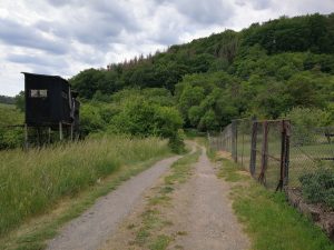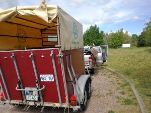 Aber nun zum Verladen. Zuerst haben wir Beide gestriegelt. Danach haben wir gesetzeskonform nun Sägespäne Anstelle von Stroh in den Wagen gestreut, zusätzlich habe ich den Heusack um einiges höher gehängt. Beim Verladen haben wir festgestellt, zuerst muss Keks hinein. Das ist problemlos. Er vertraut uns. Anders ist es mit Krümel, denn er lässt sich Bitten. Es dauerte ca. 5 Minuten mit mehrmaligem Ansteuern der Rampe und einer Möhre vor der Nase. Dann hat es geklappt. Anfangs fahre ich sehr vorsichtig, denn ich will erreichen, dass die Beiden anhängerfahren als angenehm empfinden. Am Parkplatz angekommen habe ich zuerst Krümel entladen, dann Keks. Schön ist, dass beide Pferde sehr gerade nach hinten gehen, sodass ein Danebentreten an der Rampe kaum passiert.