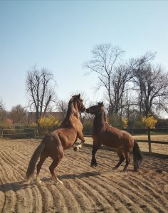 Zum neuen Thema: Wenn Keks und Krümmel toben, geht der Rauch auf! Oder durch die Trockenheit am Plaz wirbeln beide mächtig viel Staub aus. Bei jeder Gelegenheit lasse ich die Beiden toben. Sie zeigen das mit freudigen Sprüngen, Wettläufen im Speed-Galopp und den Erinnerungen an deren Männlichkeit.