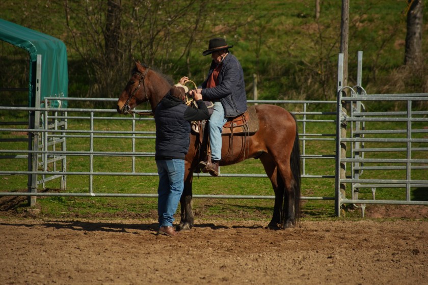 Für den Nachmittags, es ging um 14 Uhr weiter, habe ich Krümel gesattelt und Keks gleich nebenan in den Round-Pen gestellt. So hatten Beide Sichtkontakt und die Rinderarbeit war für mich als Reiter um einiges einfacher. Auch Krümel hat sich vor den Rindviechern gut verhalten und ich als Reiter habe gelernt, Kühe aus der Herde zu separieren, aus einem Gatter zu treiben und wiederum die gesamte Herde in das Gatter mit den Pferden zu bringen. Teamarbeit war gefragt. Mein Resümee ist, es hat sich für mich und meine Pferde gelohnt. Würde ich es wiederum tun? Ja.
