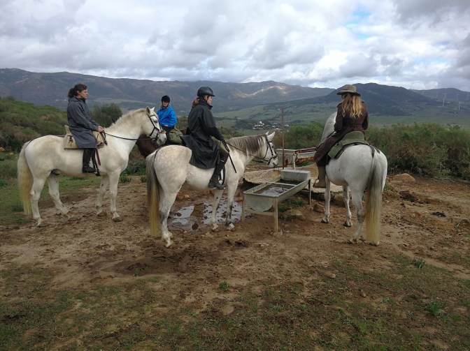 Um 8 Uhr 30 beim Stall zu sein, haben wir den Wecker auf 7 Uhr gestellt. Dann ab zum Frühstück mit viel Obst und anschließender „Plünderung“ von Käse und Wurst für das Mittagessen. Scharfe Salami und Ziegenkäse. Für die Pferde haben wir je zwei Äpfel als „Belohnung“ eingepackt. Gut gerüstet waren wir pünktlich am Stall. Kurze Begrüßung, die Pferde waren bereits von der Weide geholt und in den Boxen. Wir waren vier deutschsprachige Reitgäste, Sahra aus Deutschland als Reitgehilfin und Klaantje, die Besitzerin und Reitführerin aus den Niederlanden, welchehervorragendes Deutsch spricht. Nach kurzer Einführung in die Gepflogenheiten wurden uns die Pferde zugeteilt, vier Andalusier und zwei Araber/Andalusier in sehr guter optischer Verfassung.